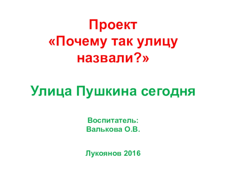 Слайд 1Проект «Почему так улицу назвали?» Улица Пушкина сегодня Воспитатель: Валькова О.В. Лукоянов 2016