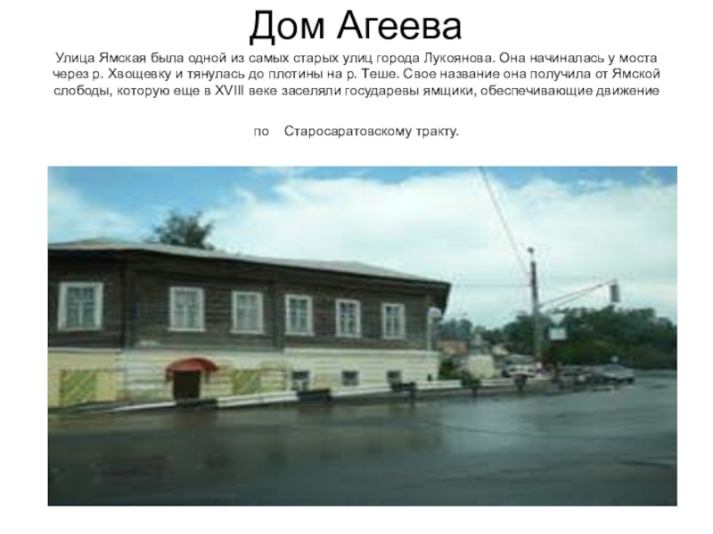 Дом Агеева  Улица Ямская была одной из самых старых улиц города Лукоянова. Она начиналась у моста