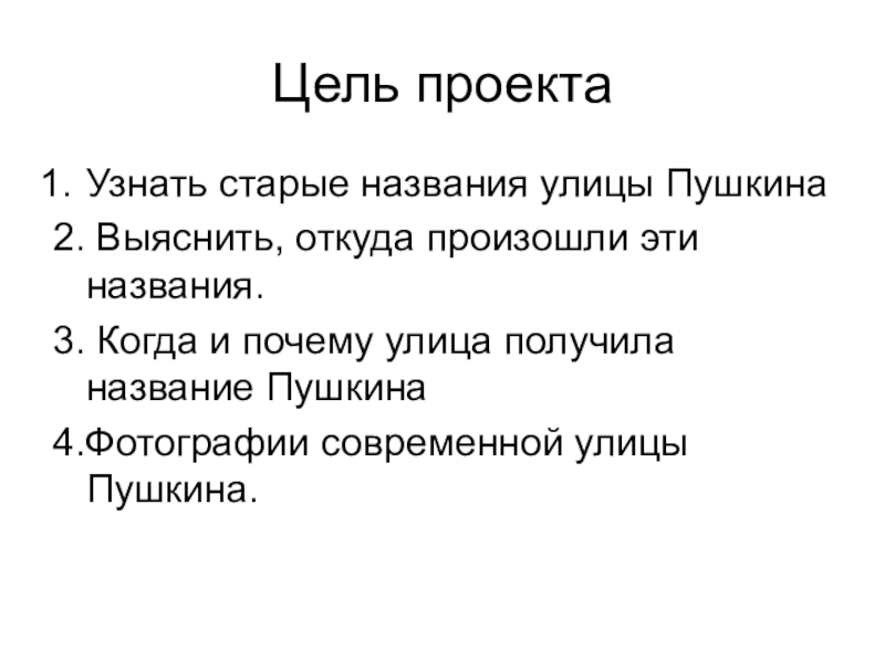 Цель проектаУзнать старые названия улицы Пушкина2. Выяснить, откуда произошли эти названия.3. Когда и почему улица получила название