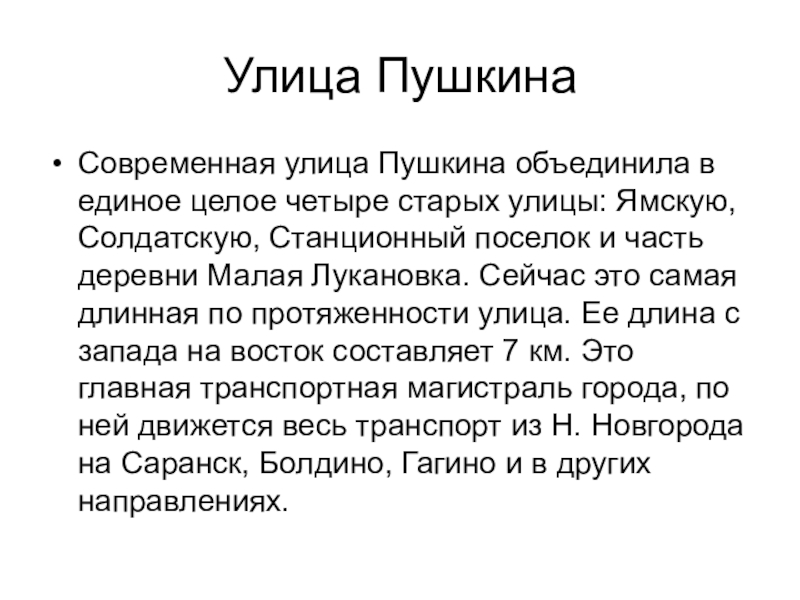 Ямскую, Солдатскую, Станционный поселок и часть деревни Малая Лукановка. Сейчас это самая длинная по протяженности улица. Ее длина с запада на восток составляет 7 км. Это главная транспортная магистраль города, по ней движется весь транспорт из Н. Новгорода на Саранск, Болдино, Гагино и в других направлениях.