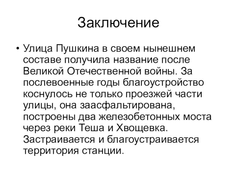 ЗаключениеУлица Пушкина в своем нынешнем составе получила название после Великой Отечественной войны. За послевоенные годы благоустройство коснулось