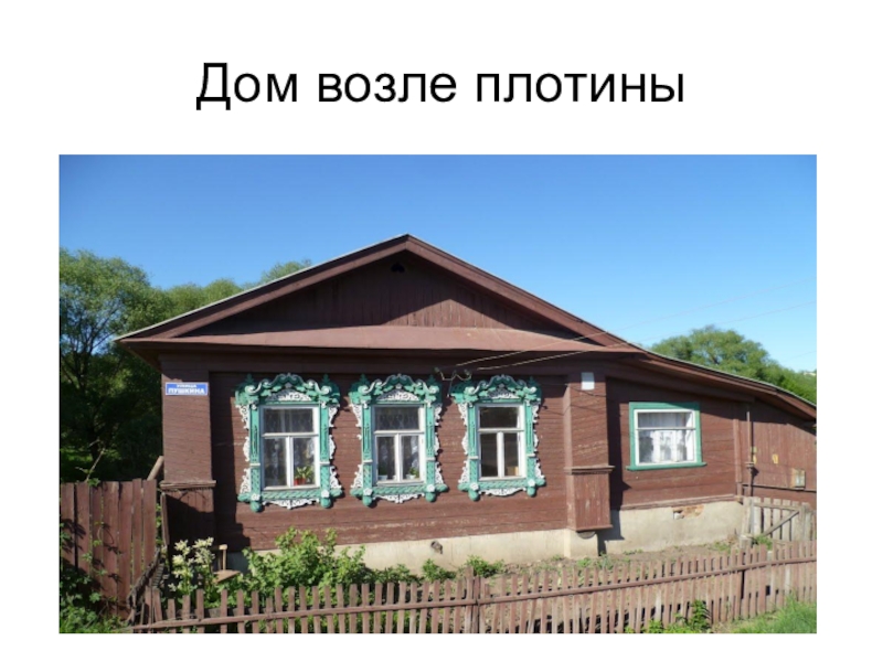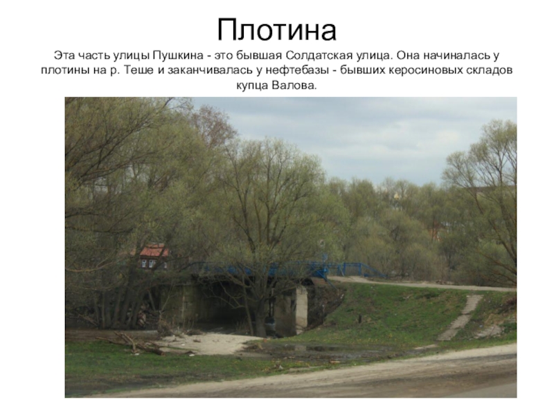 Слайд 10Плотина Эта часть улицы Пушкина - это бывшая Солдатская улица. Она начиналась