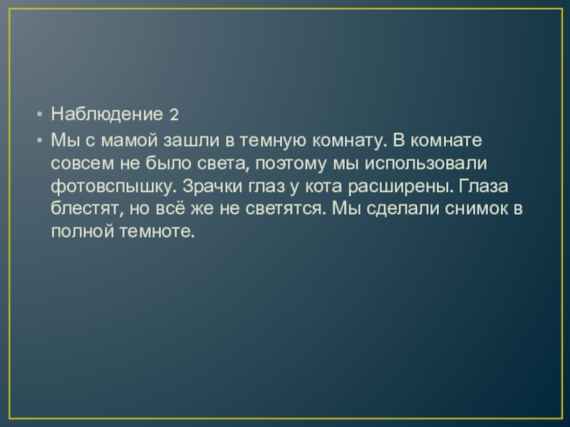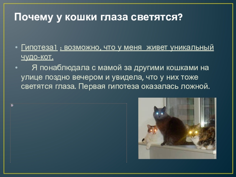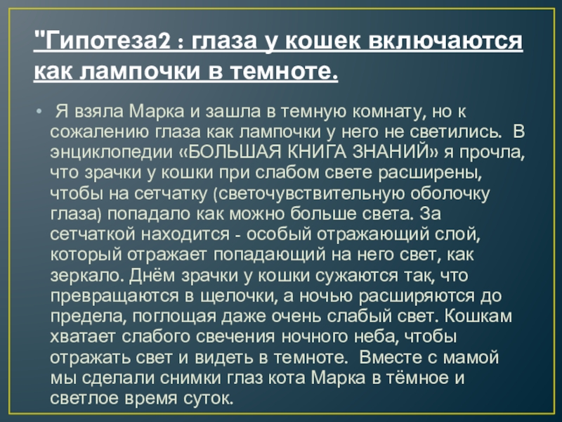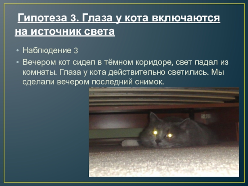 Слайд 5"Гипотеза2 : глаза у кошек включаются как лампочки в темноте.