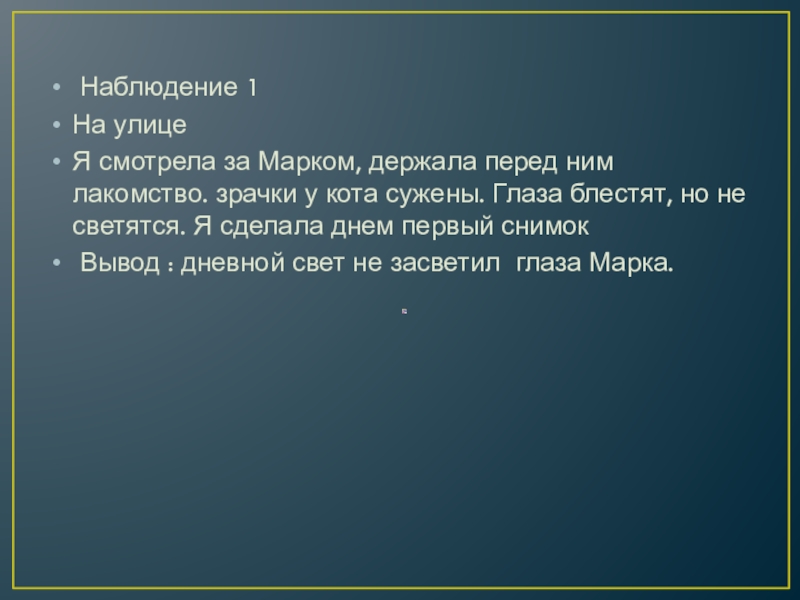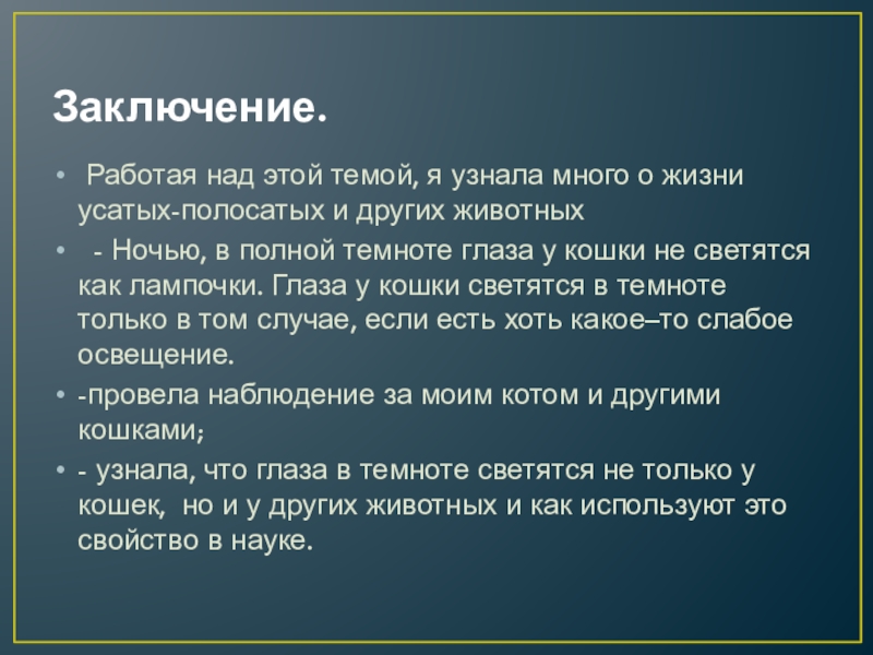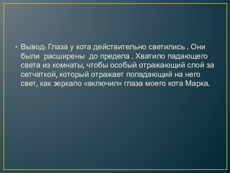Слайд 9Вывод: Глаза у кота действительно светились . Они были расширены до