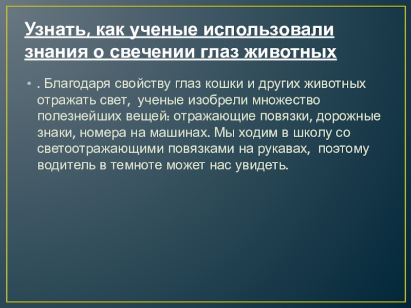 Слайд 12Узнать, как ученые использовали знания о свечении глаз животных