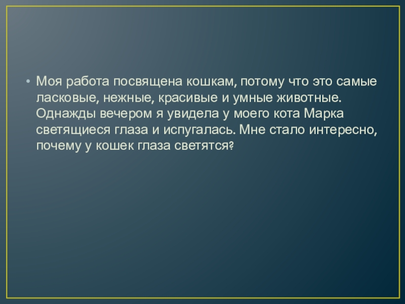 Слайд 2Моя работа посвящена кошкам, потому что это самые ласковые, нежные, красивые