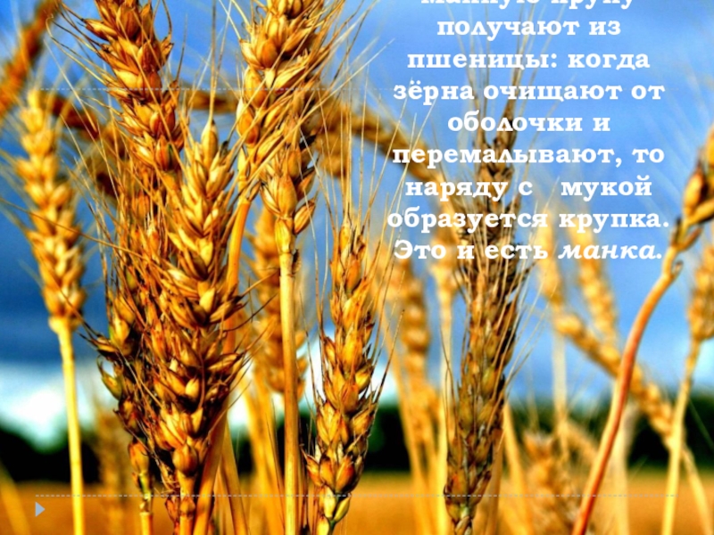 Слайд 2Манную крупу получают из пшеницы: когда зёрна очищают от оболочки и перемалывают,