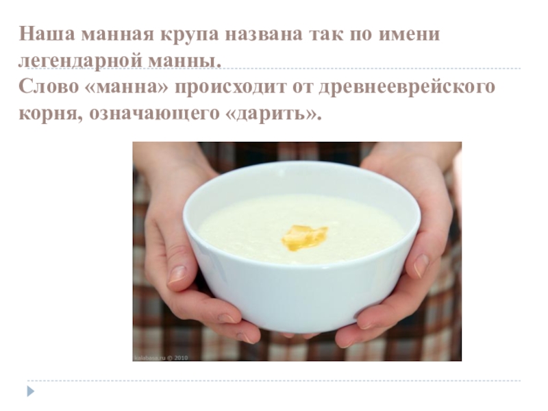 Слайд 3Наша манная крупа названа так по имени легендарной манны. Слово «манна» происходит