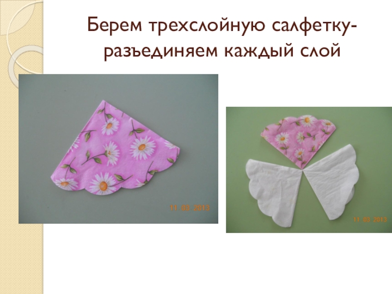 Слайд 3Берем трехслойную салфетку- разъединяем каждый слой