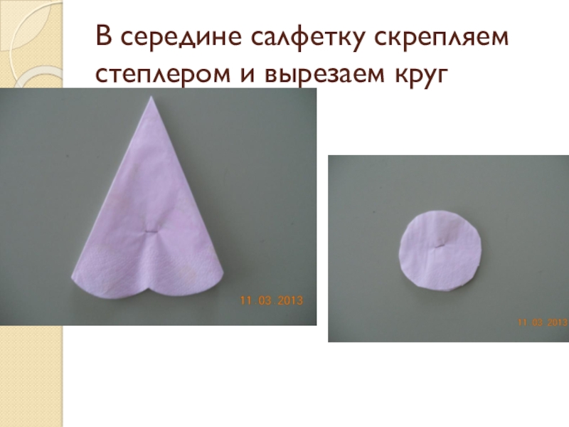 Слайд 4В середине салфетку скрепляем степлером и вырезаем круг