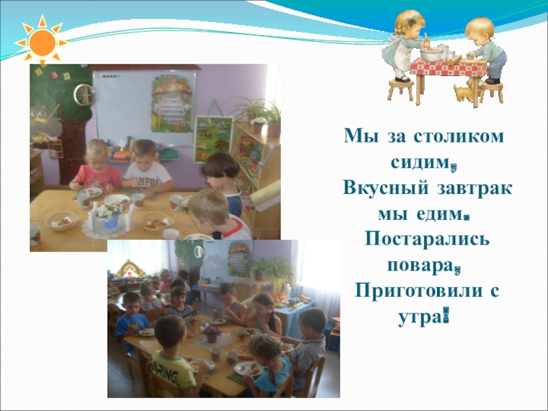 Мы за столиком сидим,  Вкусный завтрак мы едим.  Постарались повара,  Приготовили с