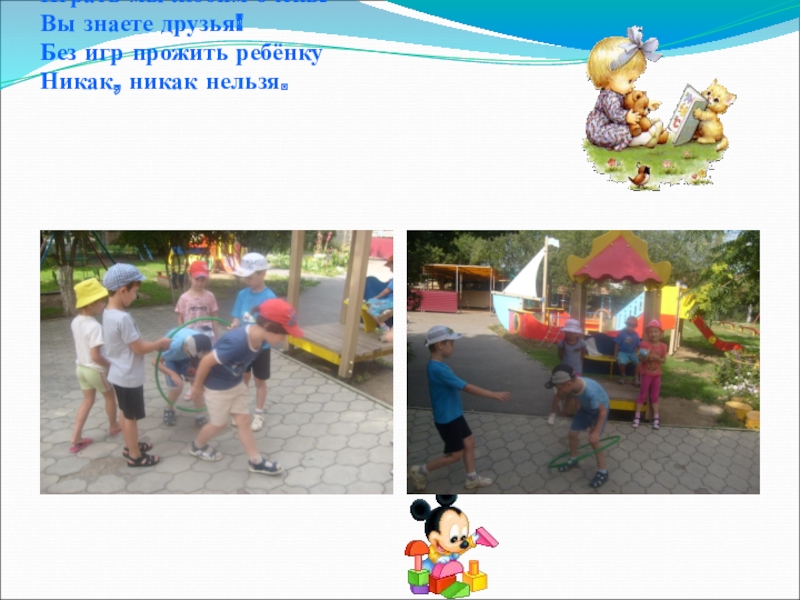 Играть мы любим очень: Вы знаете друзья! Без игр прожить ребёнку Никак, никак нельзя.