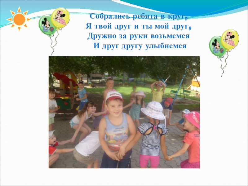 Собрались ребята в круг, Я твой друг и ты мой друг, Дружно за руки возьмемся И друг другу улыбнемся