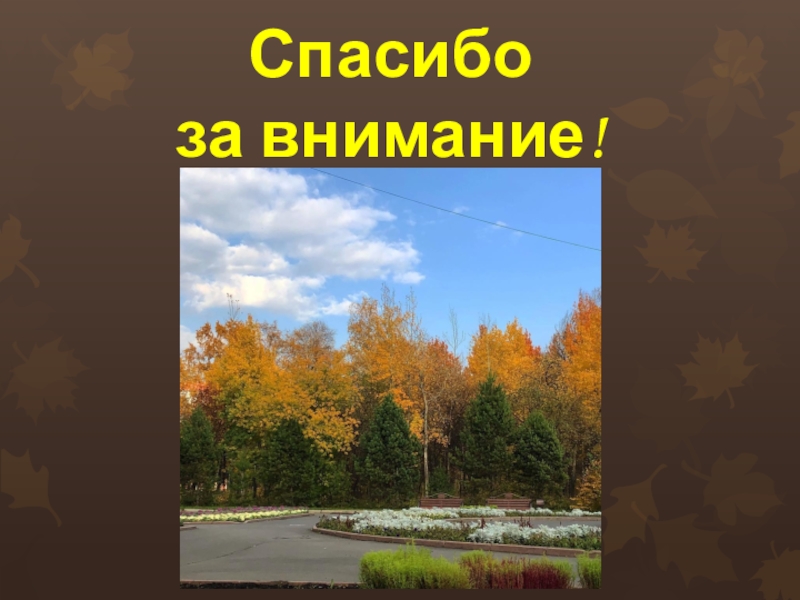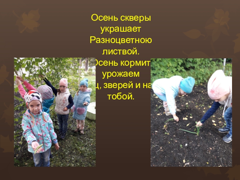 Слайд 3Осень скверы украшает Разноцветною листвой. Осень кормит урожаем Птиц, зверей и нас с тобой.