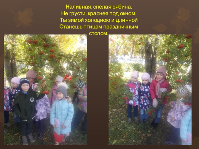 Наливная, спелая рябина,Не грусти, краснея под окном.Ты зимой холодною и длиннойСтанешь птицам праздничным столом.
