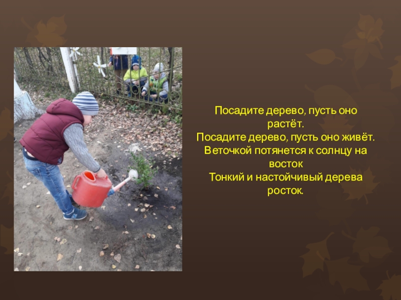 Посадите дерево, пусть оно растёт. Посадите дерево, пусть оно живёт. Веточкой потянется к солнцу на восток Тонкий