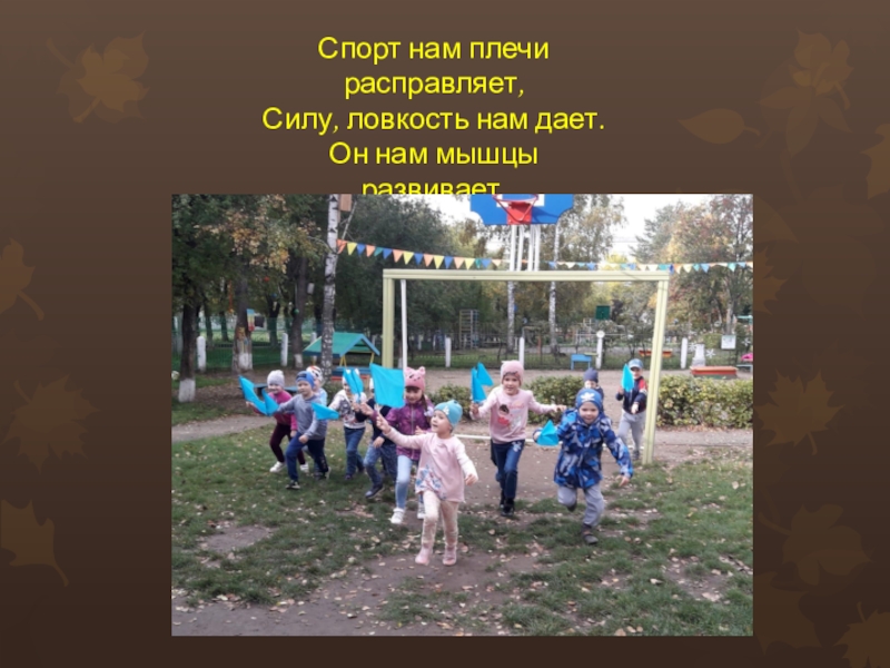Слайд 4Спорт нам плечи расправляет, Силу, ловкость нам дает. Он нам мышцы развивает, На рекорды