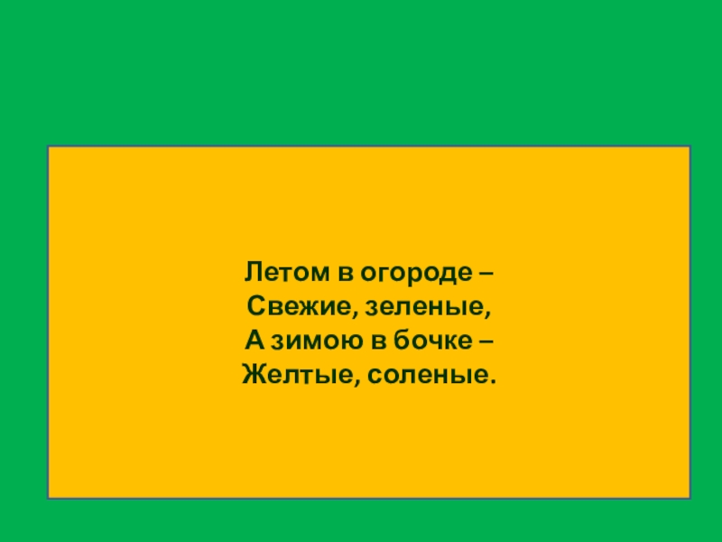 Летом в огороде –Свежие, зеленые,А зимою в бочке – Желтые, соленые.