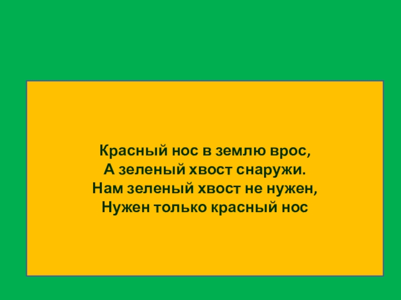 Красный нос в землю врос,А зеленый хвост снаружи.Нам зеленый хвост не нужен,Нужен только красный нос