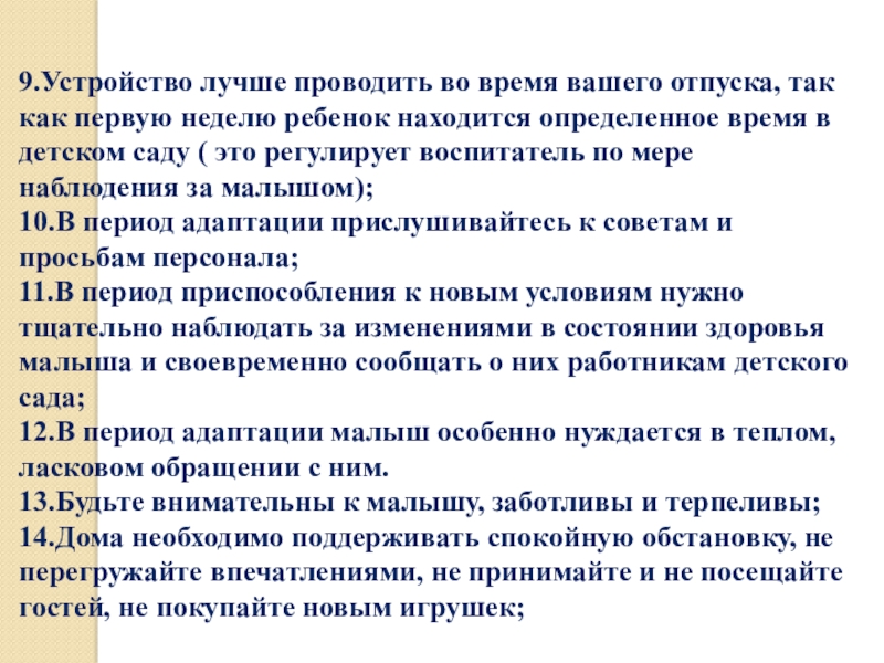 11.В период приспособления к новым условиям нужно тщательно наблюдать за изменениями в состоянии здоровья малыша и своевременно сообщать о них работникам детского сада;