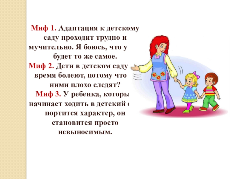 Слайд 3Миф 1. Адаптация к детскому саду проходит трудно и мучительно. Я