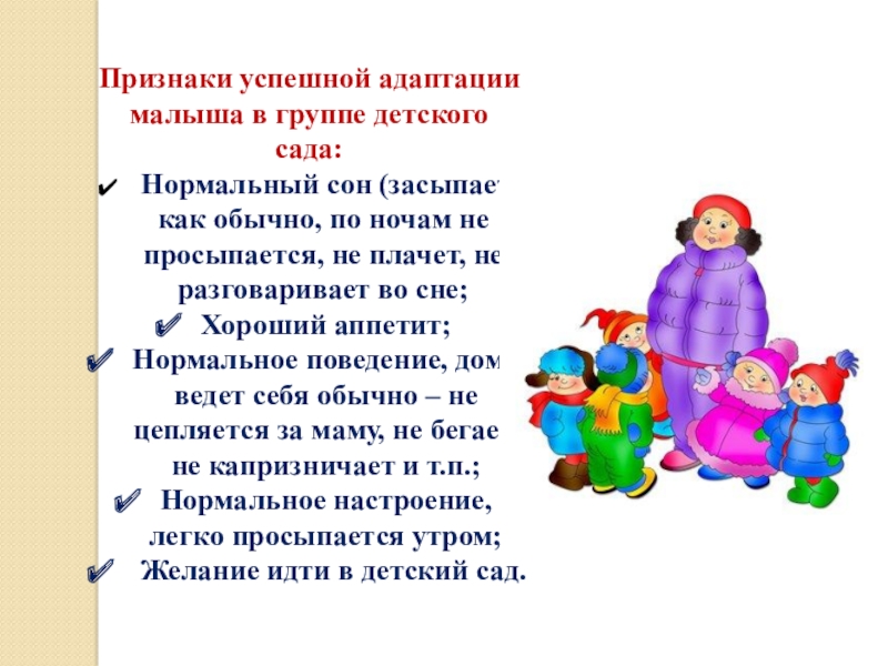 Слайд 8Признаки успешной адаптации малыша в группе детского сада: