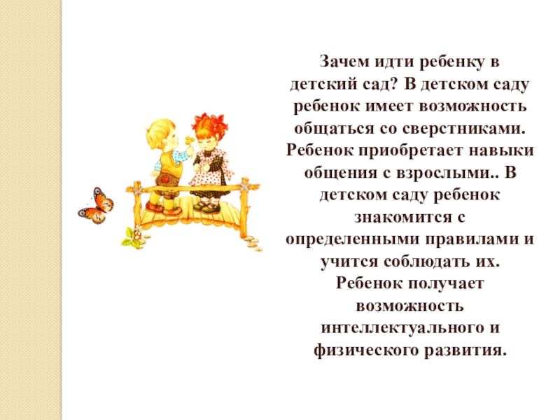 возможность общаться со сверстниками. Ребенок приобретает навыки общения с взрослыми.. В детском саду ребенок знакомится с определенными правилами и учится соблюдать их. Ребенок получает возможность интеллектуального и физического развития.