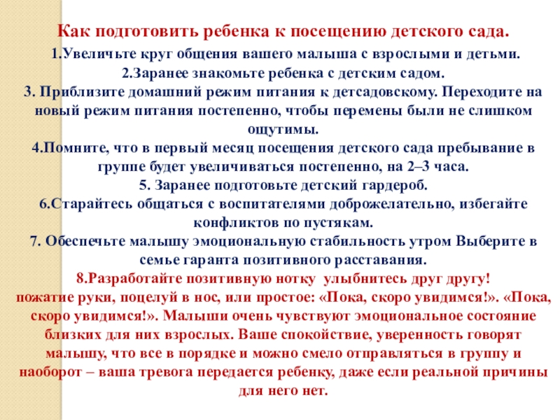 Слайд 10Как подготовить ребенка к посещению детского сада.