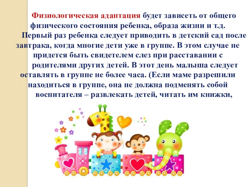 Слайд 7Физиологическая адаптация будет зависеть от общего физического состояния ребенка, образа жизни