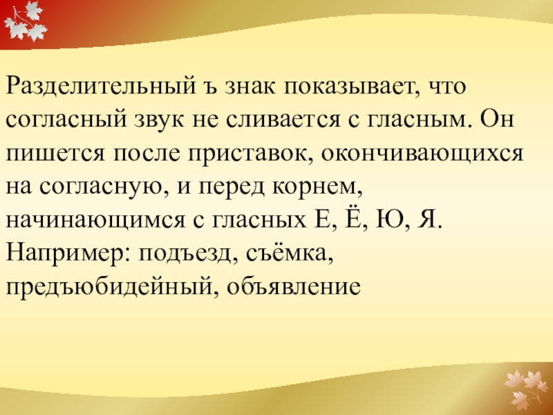 Он пишется после приставок, окончивающихся на согласную, и перед корнем, начинающимся с гласных Е, Ё, Ю, Я. Например: подъезд, съёмка, предъюбидейный, объявление
