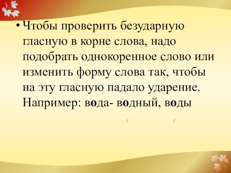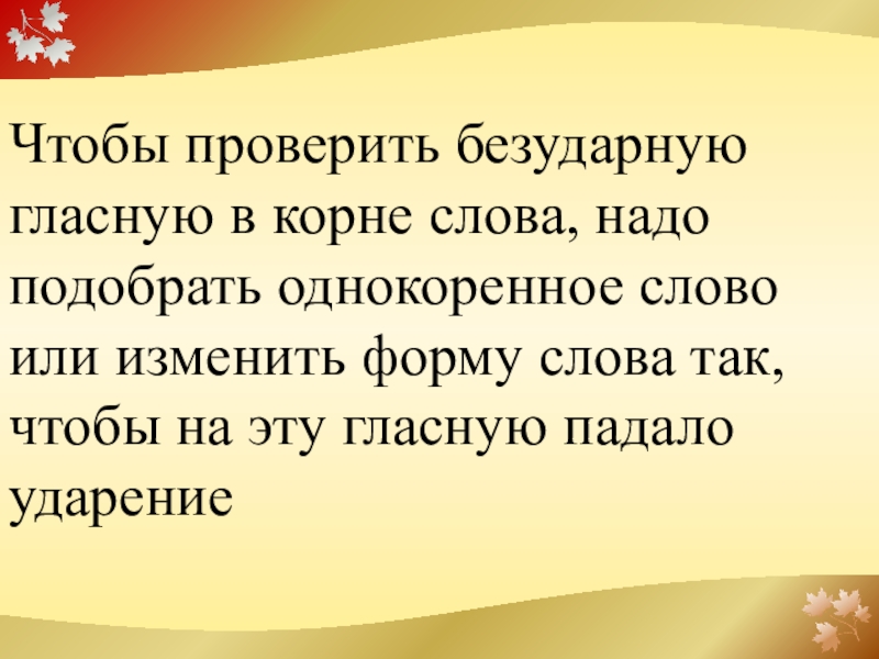 Слайд 14Чтобы проверить безударную гласную в корне слова, надо подобрать однокоренное слово