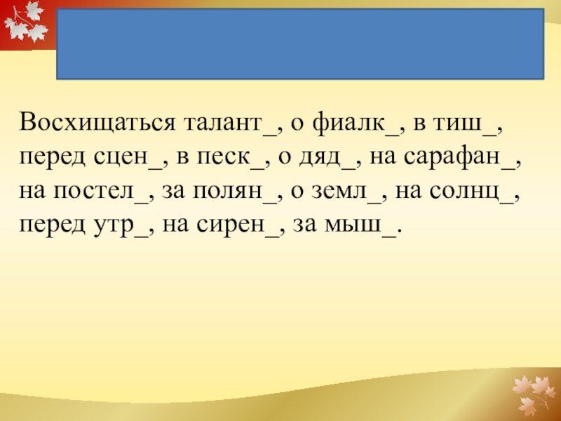 тиш_, перед сцен_, в песк_, о дяд_, на сарафан_, на постел_, за полян_, о земл_, на солнц_, перед утр_, на сирен_, за мыш_.