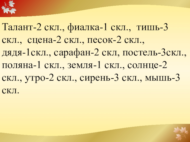 Слайд 19Талант-2 скл., фиалка-1 скл., тишь-3 скл., сцена-2 скл., песок-2 скл., дядя-1скл.,