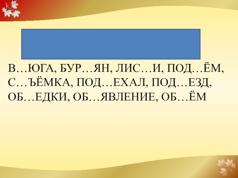 В…ЮГА, БУР…ЯН, ЛИС…И, ПОД…ЁМ,С…ЪЁМКА, ПОД…ЕХАЛ, ПОД…ЕЗД, ОБ…ЕДКИ, ОБ…ЯВЛЕНИЕ, ОБ…ЁМ