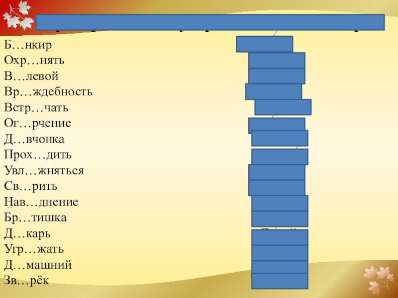 Груп…а, ап…етит, ак…орд, хок…ей, жуж…ать, ал…ея,трол…ейбус,сум…а,тен…ис,кор…еспон-дент, пас…ажир, крос…, осен…ий, кас…а,