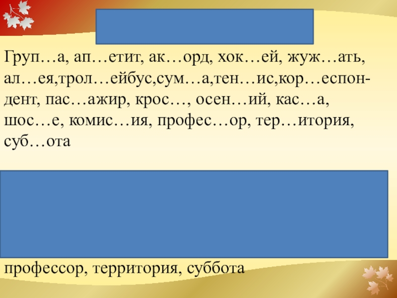 Группа, аппетит, аккорд, хоккей, жужжать, аллея, троллейбус, сумма, теннис, корреспондент, пассажир, кросс, осенний, касса, шоссе, комиссия, профессор, территория, суббота