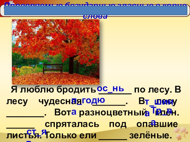 лесу. В лесу чудесная _______. В лесу ________. Вот разноцветный клён. ______ спряталась под опавшие листья. Только ели ______ зелёные.