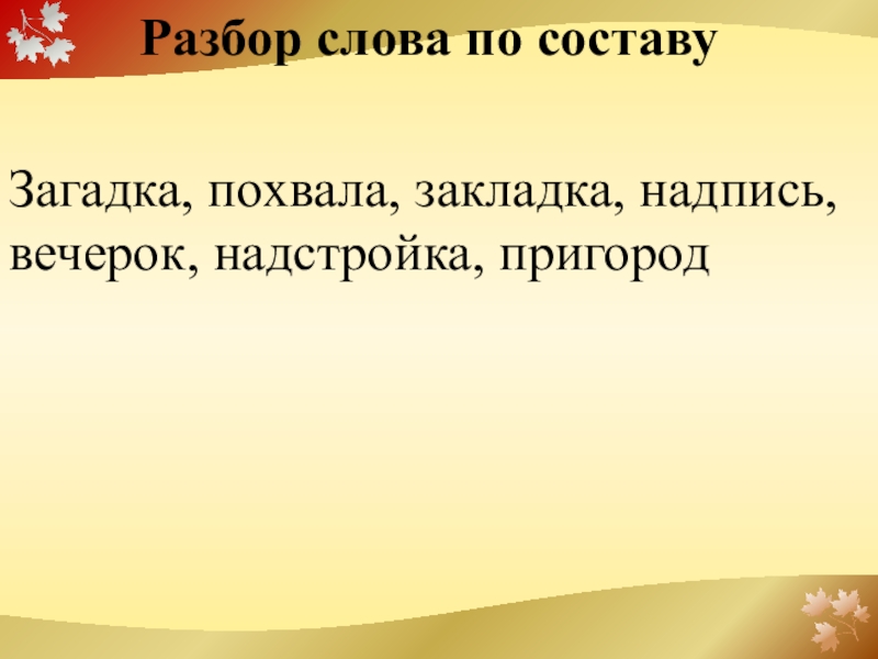Слайд 11Загадка, похвала, закладка, надпись, вечерок, надстройка, пригород