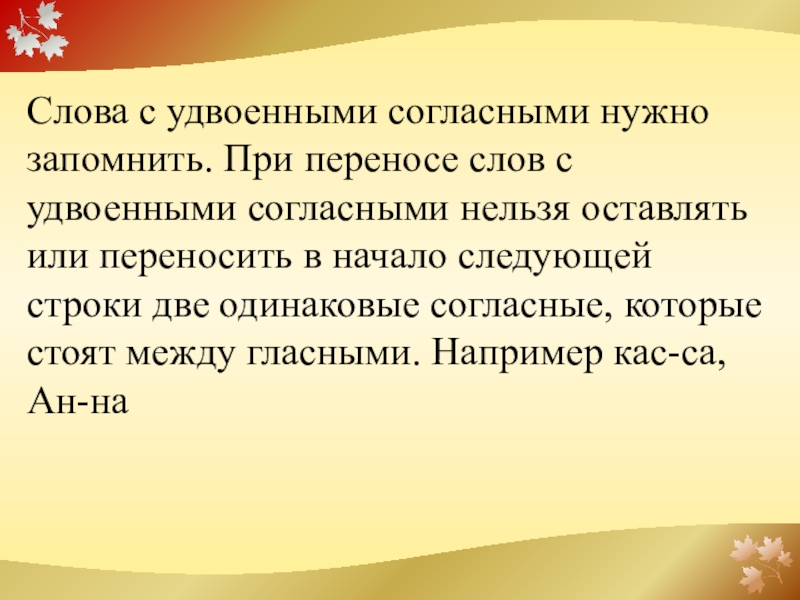 Слайд 10Слова с удвоенными согласными нужно запомнить. При переносе слов с удвоенными