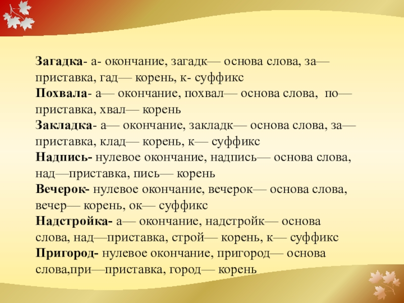 Слайд 12Загадка- а- окончание, загадк— основа слова, за— приставка, гад— корень, к-