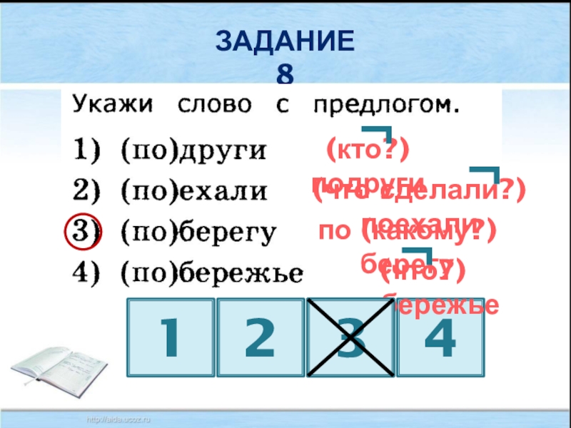 Задание 81234(кто?) подруги(что сделали?) поехалипо (какому?) берегу(что?) побережь嬬¬3