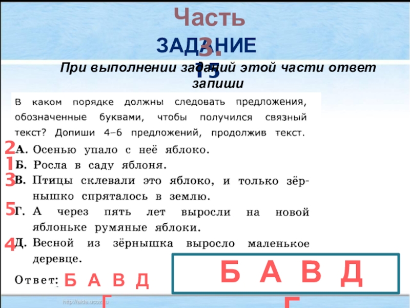 Задание 15Часть 3.При выполнении заданий этой части ответ запиши в прямоугольнике.12345Б А В Д ГБ А В