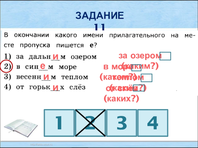 Задание 11за озером (каким?)ив море (каком?)етеплом (каким?) иот слёз (каких?) и12342