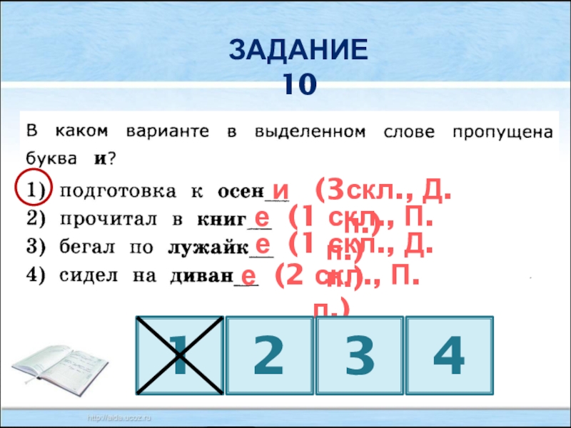 Задание 10и  (3скл., Д.п.)е (1 скл., П.п.)е (1 скл., Д.п.)е (2 скл., П.п.)12341