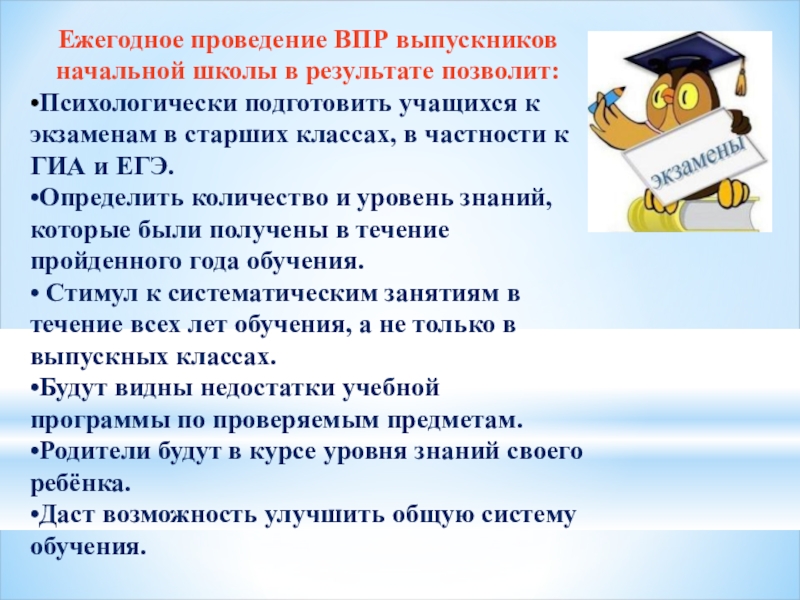 Слайд 23Ежегодное проведение ВПР выпускников начальной школы в результате позволит: