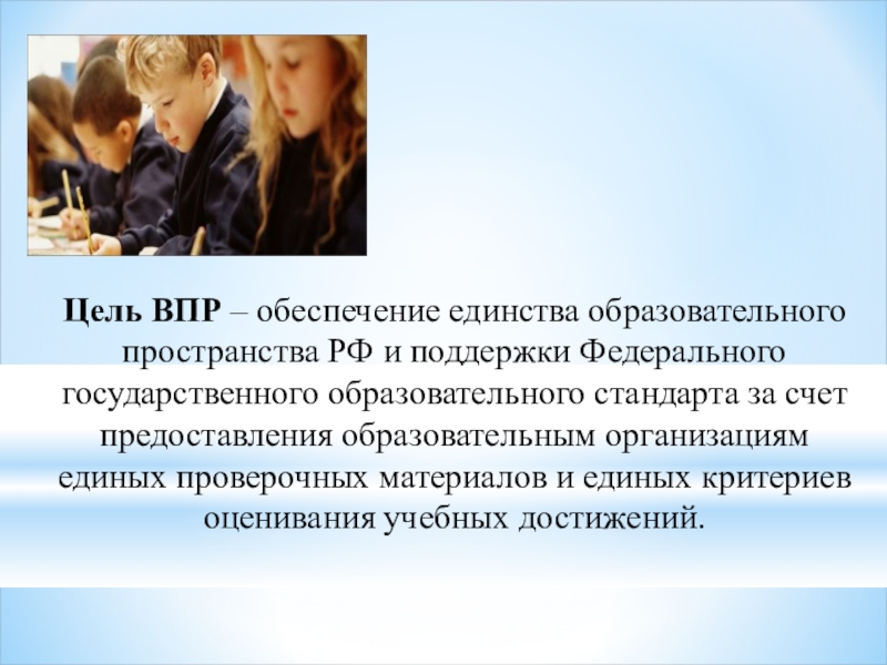 Слайд 3Цель ВПР – обеспечение единства образовательного пространства РФ и поддержки Федерального