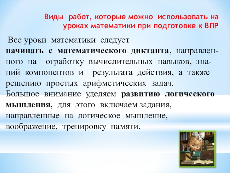 Слайд 20Виды работ, которые можно использовать на уроках математики при подготовке к