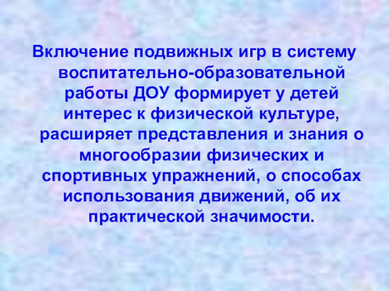 Включение подвижных игр в систему воспитательно-образовательной работы ДОУ формирует у детей интерес к физической культуре, расширяет представления