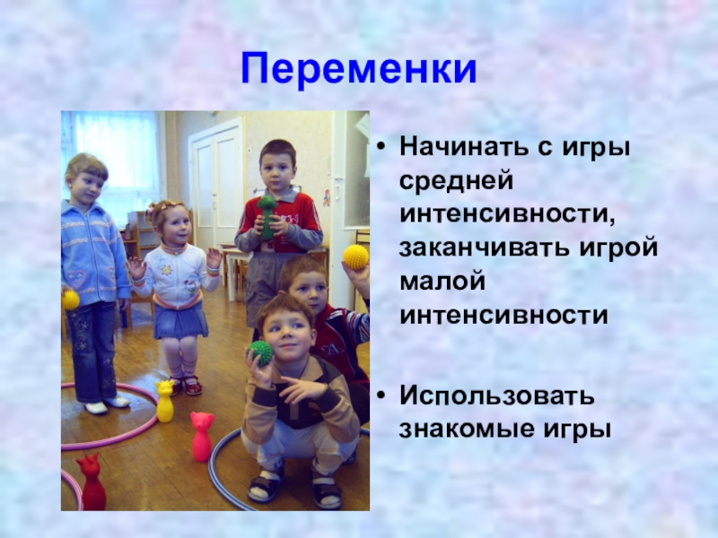 Переменки Начинать с игры средней интенсивности, заканчивать игрой малой интенсивностиИспользовать знакомые игры