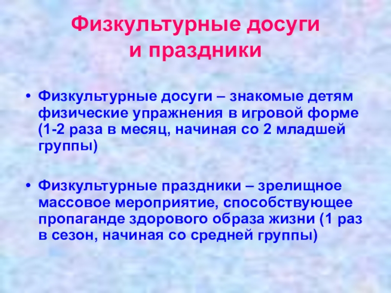 Физкультурные досуги  и праздникиФизкультурные досуги – знакомые детям физические упражнения в игровой форме (1-2 раза в